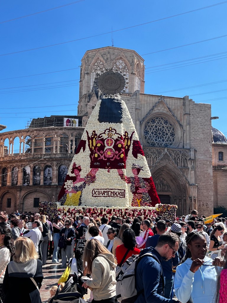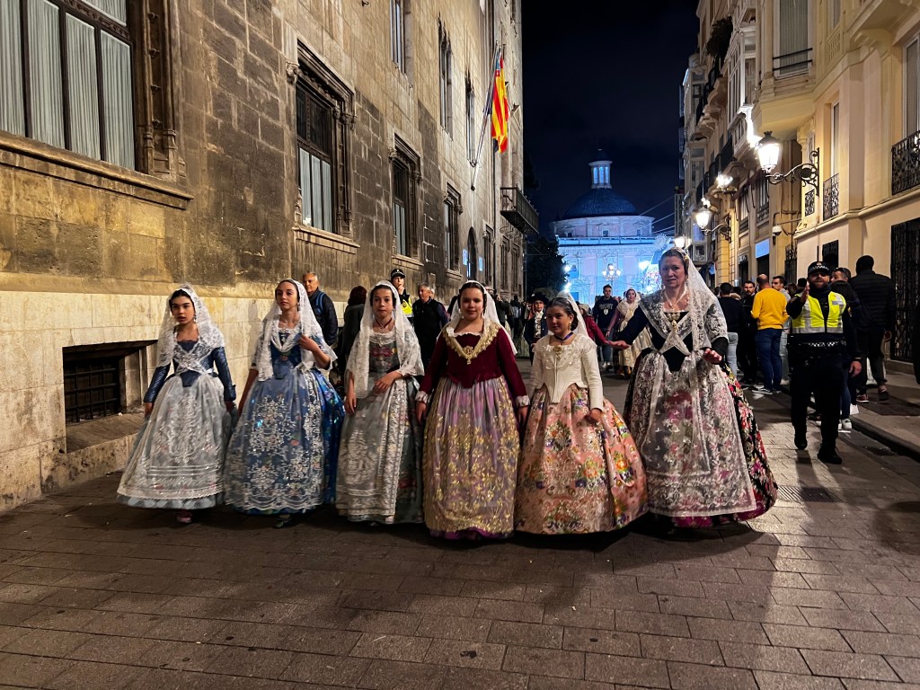 D’abord, les offrandes à la vierge en fleurs. Tous les comités de Fallas de la ville défilent depuis leurs quartiers jusqu’à la Plaza de la Virgen pour faire une offrande de fleurs à la Virgen de los Desamparados, patronne de Valence. L’événement dure de 16 heures jusque tard dans la nuit, et les bouquets sont utilisés pour confectionner une impressionnante tapisserie de 15 mètres de haut qui orne le manteau de la Vierge.